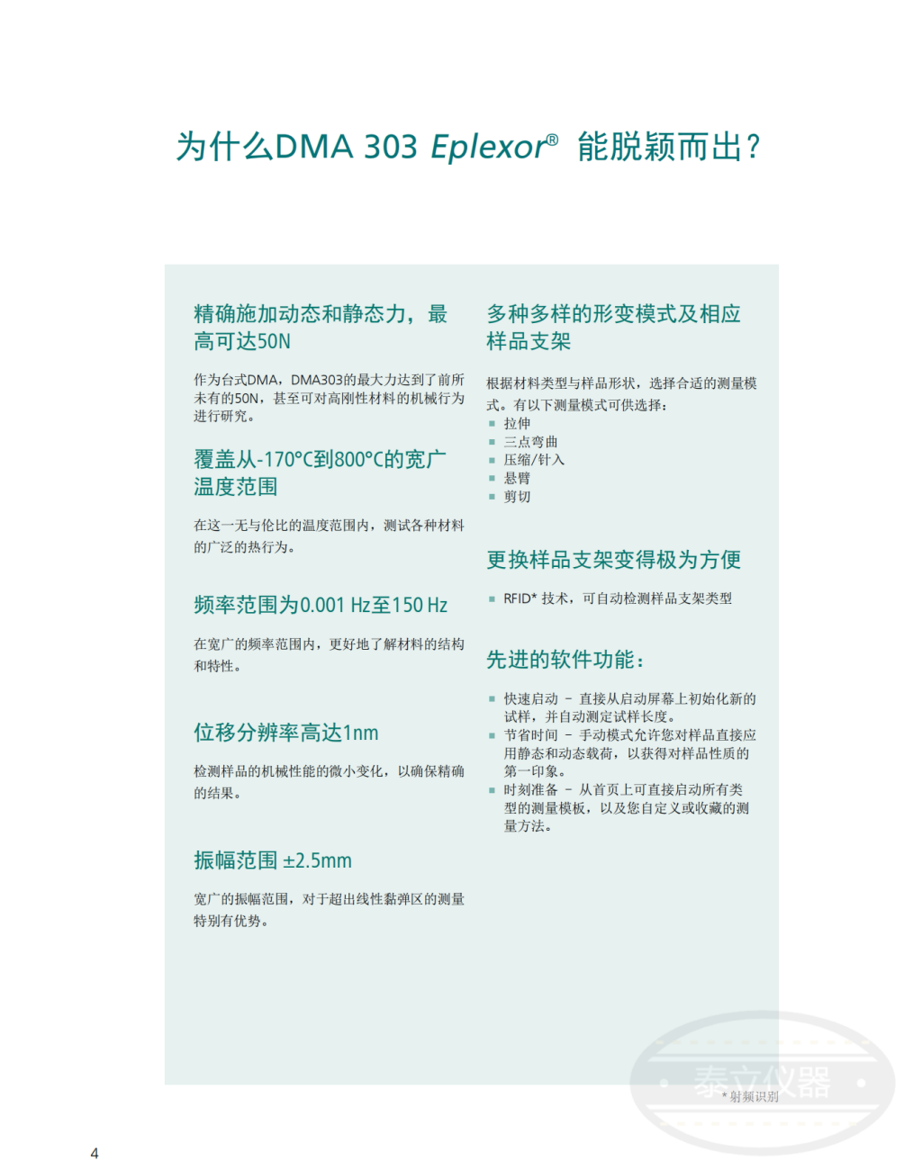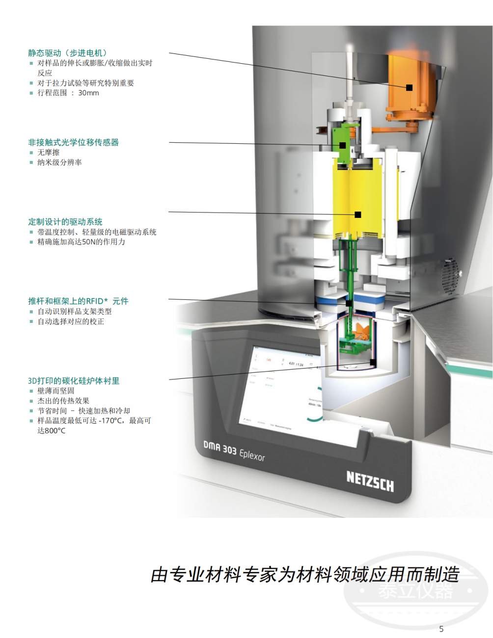 DMA 303 Eplexor 吸收了耐驰“同门”的诸多特点并发扬光大,是一台真正革命性的DMA系统。它不但能够快速而方便地表征材料的动态热机械性能与频率、温度、时间的关系,并且支持各类静态模式,如万能试验机模式、蠕变,松弛和 TMA 模式等等。