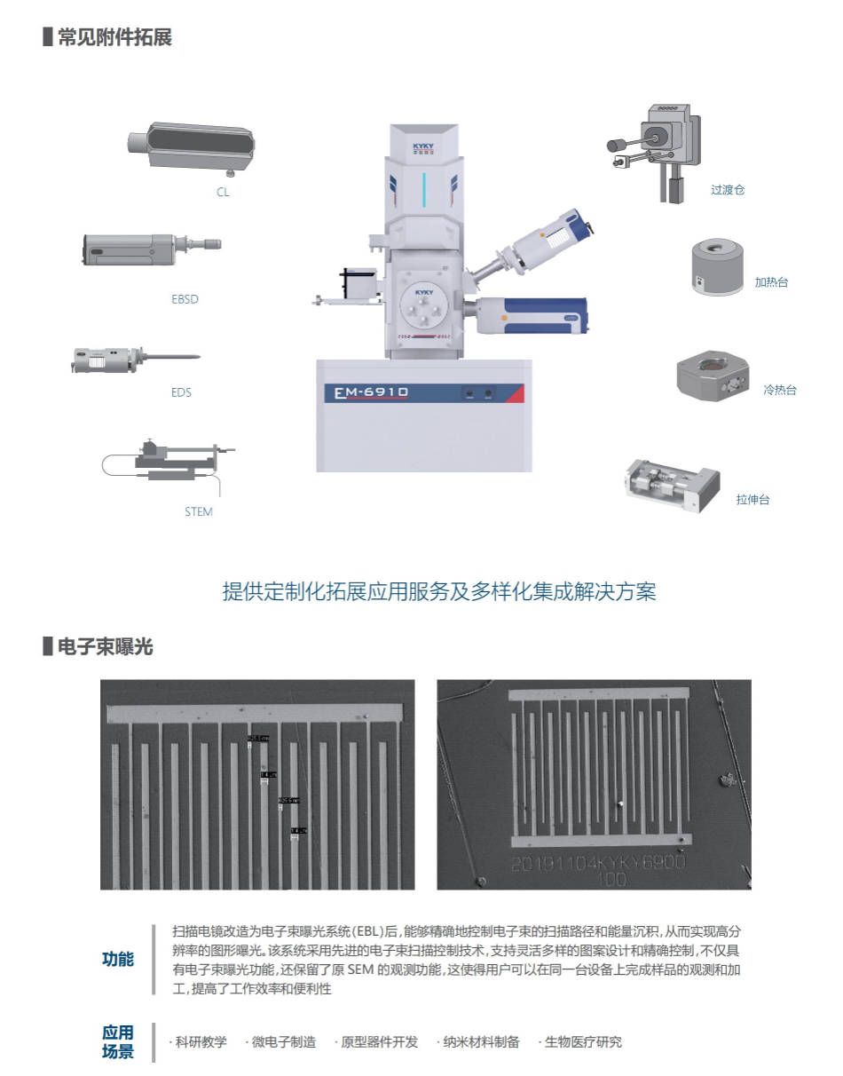 兼容低真空功能、丰富的自动化功能、支持定制化、选配多功能超大样品仓、大视野导航相机、拓展丰富。 拓展功能:可以拓展多种探测器以及提供多种定制化服务以及解决方案。 电子束曝光功能: 扫描电镜改造为电子束曝光系统(EBL)后,能够精确地控制电子束的扫描路径和能量沉积,从而实现高分辨率的图形曝光。该系统采用先进的电子束扫描控制技术,支持灵活多样的图案设计和精确控制,不仅具有电子束曝光功能,还保留了原SEM 的观测功能,这使得用户可以在同一台设备上完成样品的观测和加工,提高了工作效率和便利性。