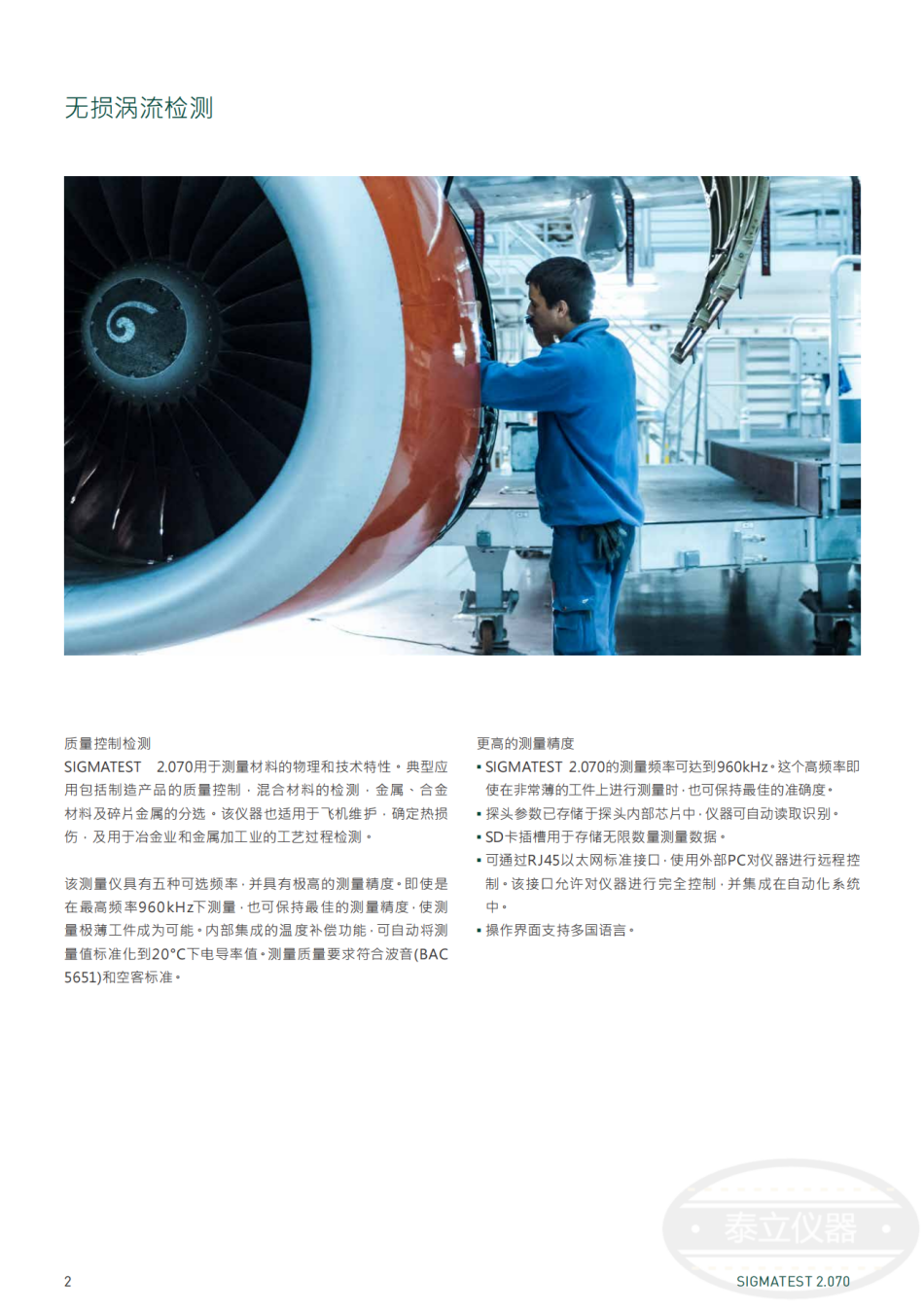 SIGMATEST 2.070 用于测量材料的物理和技术特性,该仪器适用于飞机维护,确定热损伤,及用于冶金业和金属加工业的工艺过程检测。测量质量要求符合波音(BAC 5651)和空客标准。航空铝材是导体具有良好的导电性能。