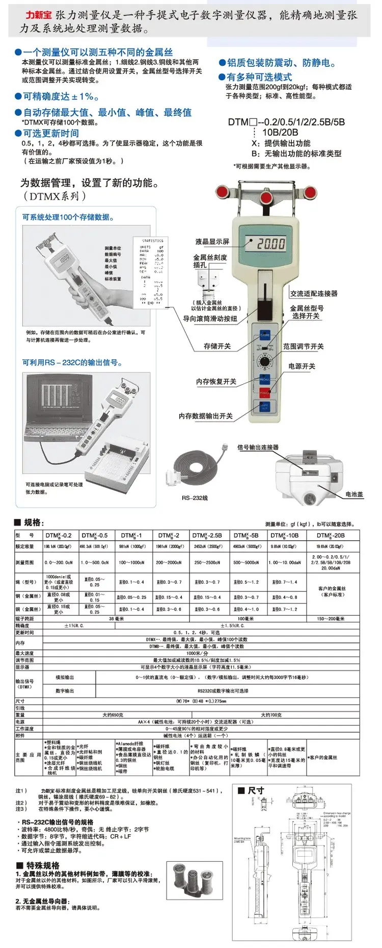 详细信息| 询价留言品牌:日本SHIMPO 加工定制:否 型号:DTMB-0.2 测量范围:0.0~200gf 显示方式:数字 分辨率:±1%F.S. 电源电压:6 V 用途:金属丝张力测量 分辨率:±1%F.S. 日本力新宝张力计DTMB-0.2C 参数