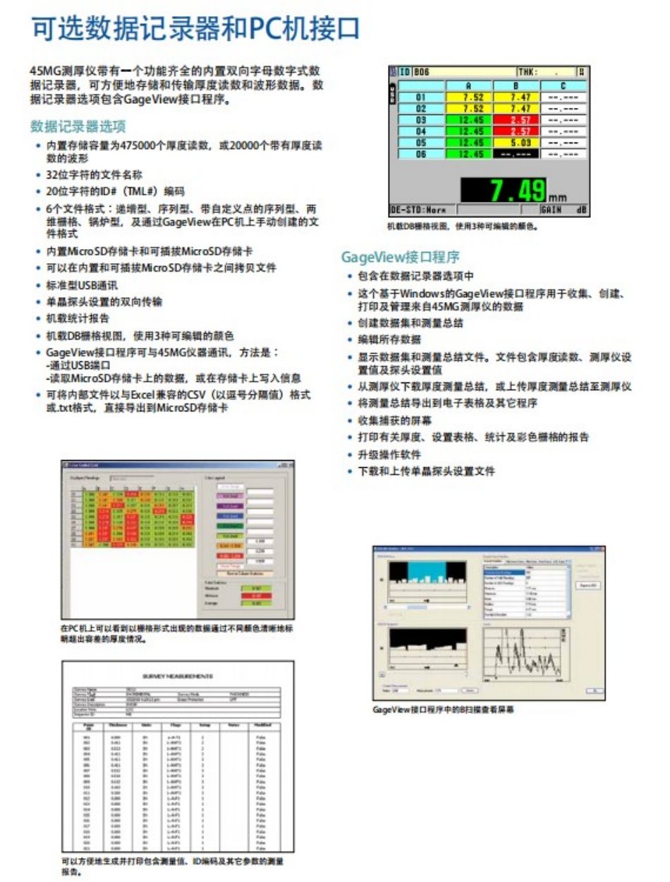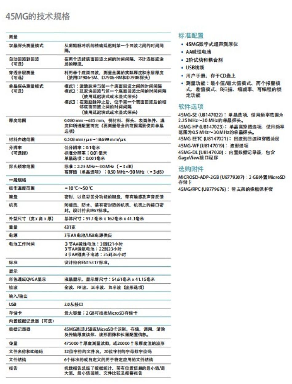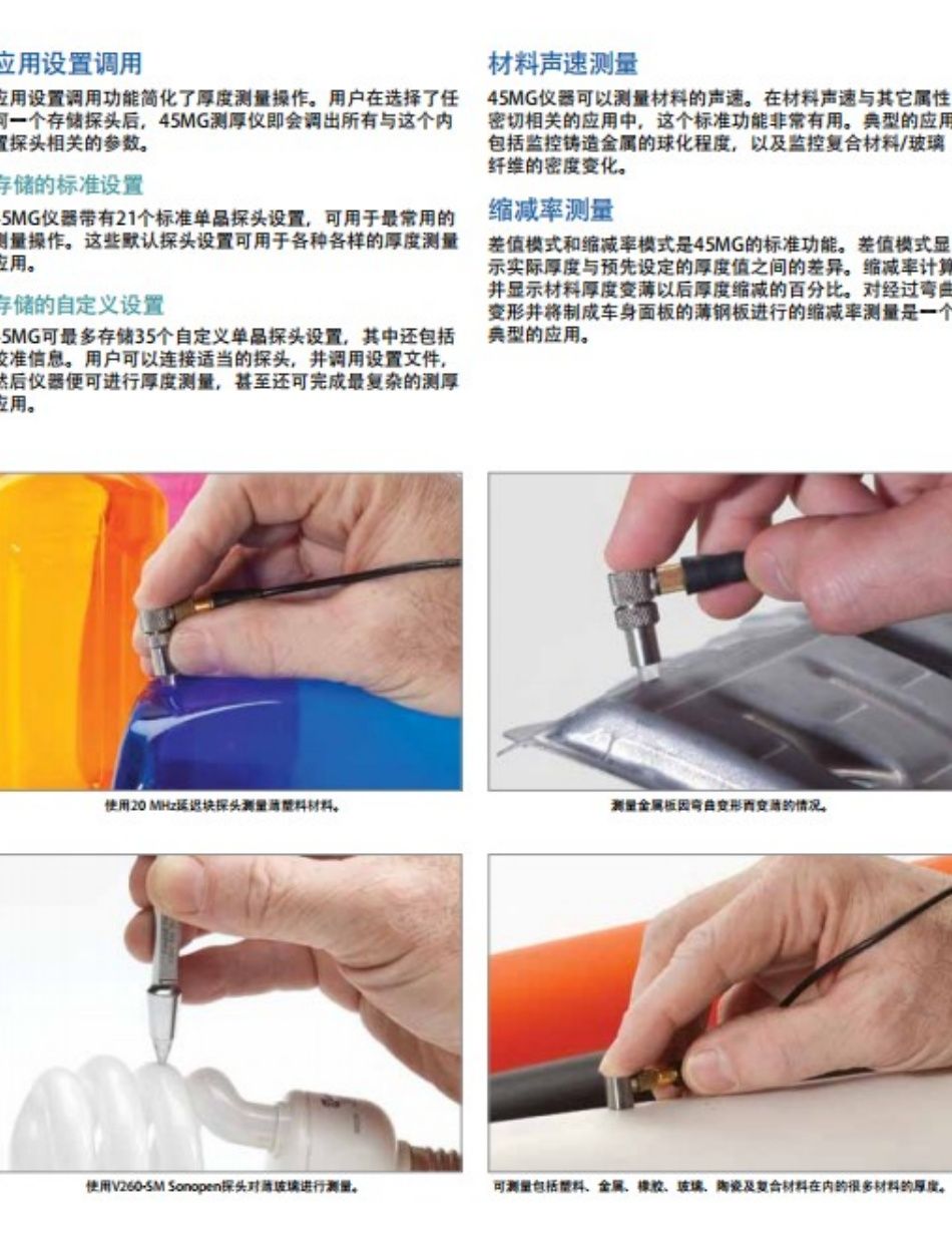 此外,基于45MG测厚仪所测量的声速和材料密度而计算的杨氏模量和剪切弹性模量,以及泊松比,可以确定材料是否具有均质性、各向同性,或非分散性。可测量的材料包括普通金属、工业陶瓷和硬塑料,如聚苯乙烯和丙烯酸。