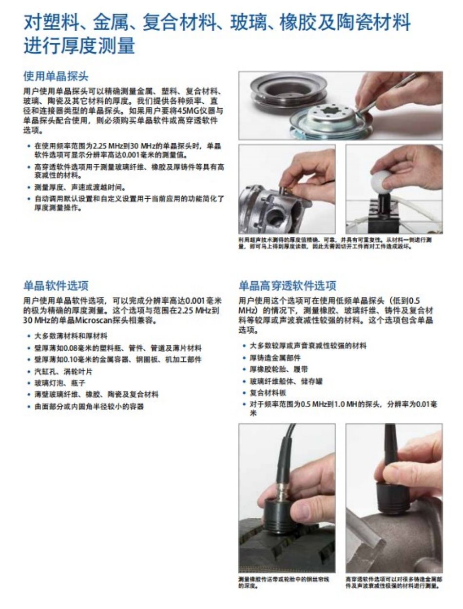 配有单晶软件的45MG测厚仪可以测量飞机窗户和复合材料的厚度,并检测材料的分层情况,在飞机质量控制中起着举足轻重的作用。