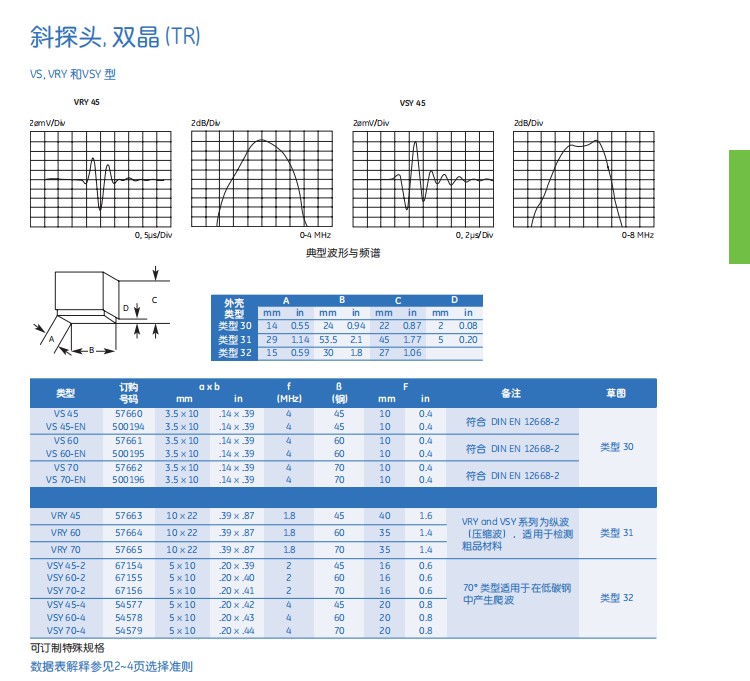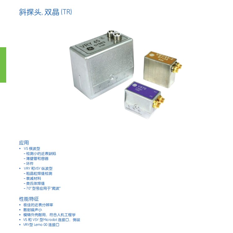 美国GE超声波探头 VRY..:用于测试那些由于具有高的声波散射特性而不能用横波进行测试的中大型尺寸的厚壁物体(如奥氏体钢制成的容器、化工和能源厂的奥氏体焊接件)。低碳钢中蠕变波Creeping的激发是利用70°探头实现的。