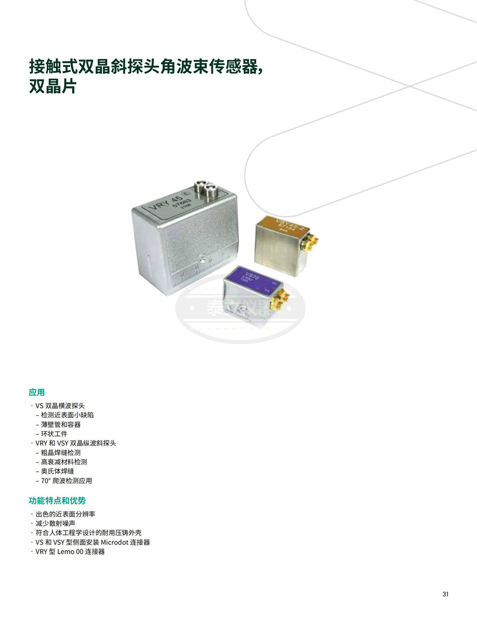 }MPKL 2双晶系列纵波斜探头—复合材料压电晶片 频率(MHZ) 接触面(mm) 角度( °) 深度范围 VRY 45